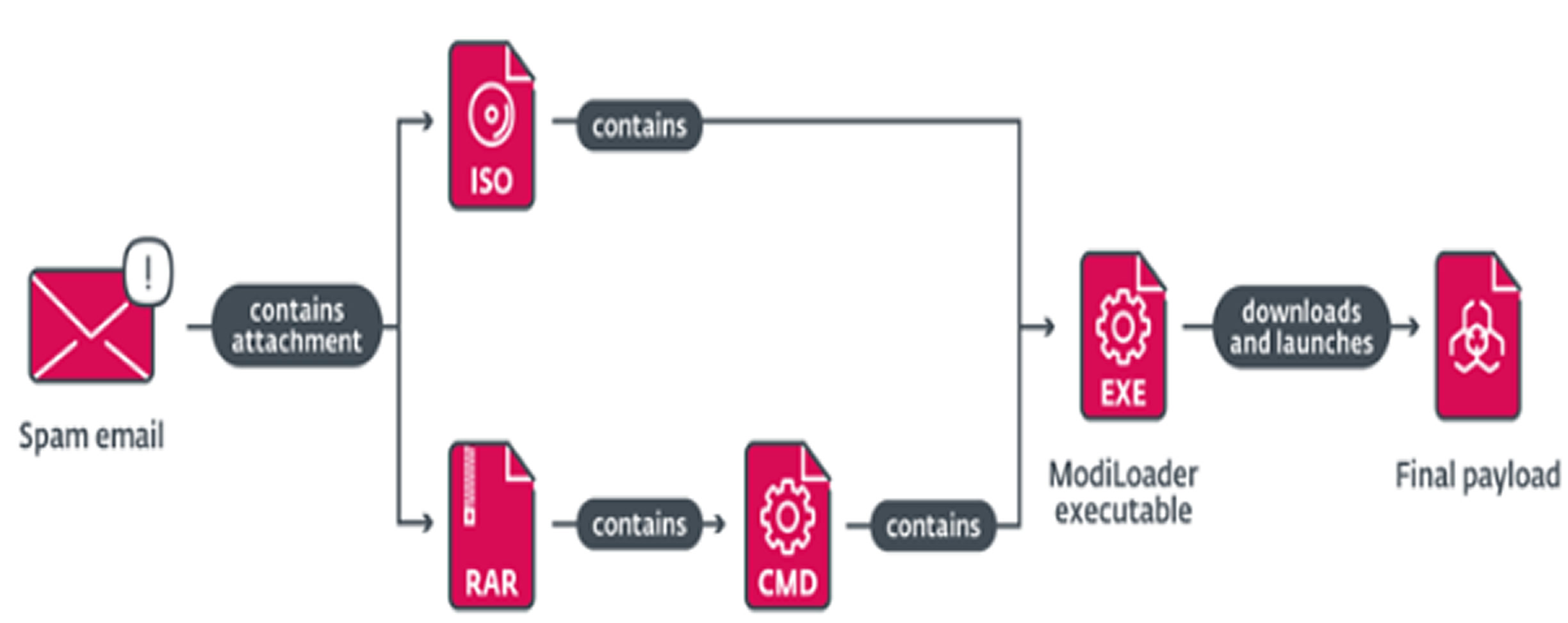 The attacks started with phishing emails containing malware-laced RAR or ISO attachments. If an ISO file was attached, it directly executed DBatLoader. If a RAR archive was used, it contained an obfuscated Windows batch script that executed a Base64-encoded ModiLoader, disguised as a PEM-encoded certificate revocation list.