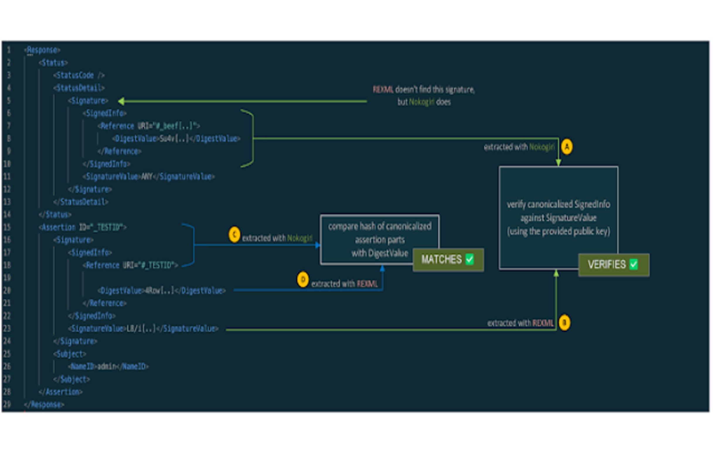 Both vulnerabilities stem from the way two XML parsing libraries, REXML and Nokogiri, interpret XML differently. This discrepancy in parsing behavior can result in inconsistent document structures, creating an opportunity for attackers to execute a Signature Wrapping attack, which ultimately enables authentication bypass.