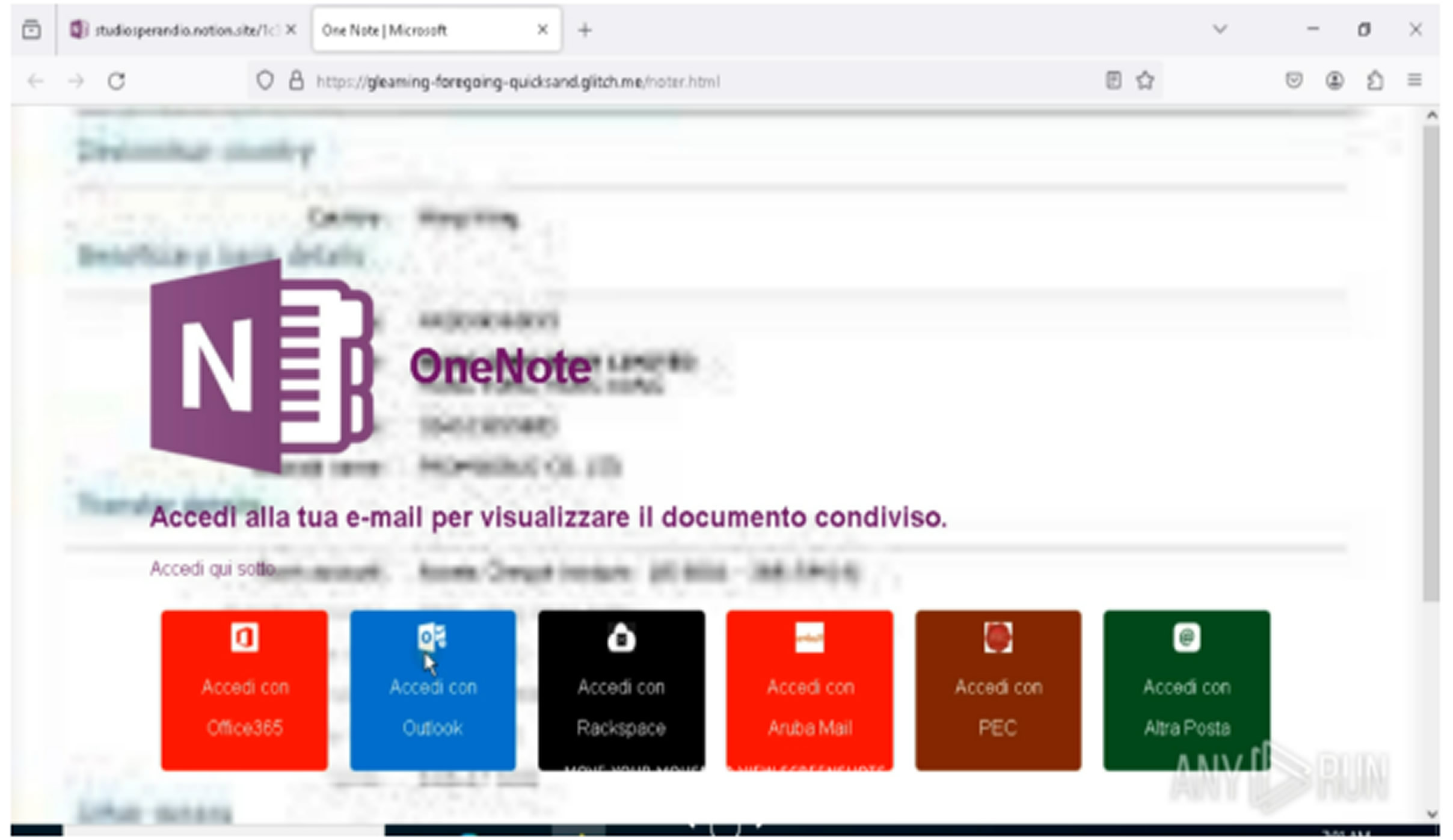 Attackers begin by hosting convincing fake login pages on trusted platforms such as Notion, Glitch, Google Docs, and RenderForest. Victims typically receive phishing emails with subject lines like “New Document Shared with you,” which redirect them to fraudulent OneNote login prompts.