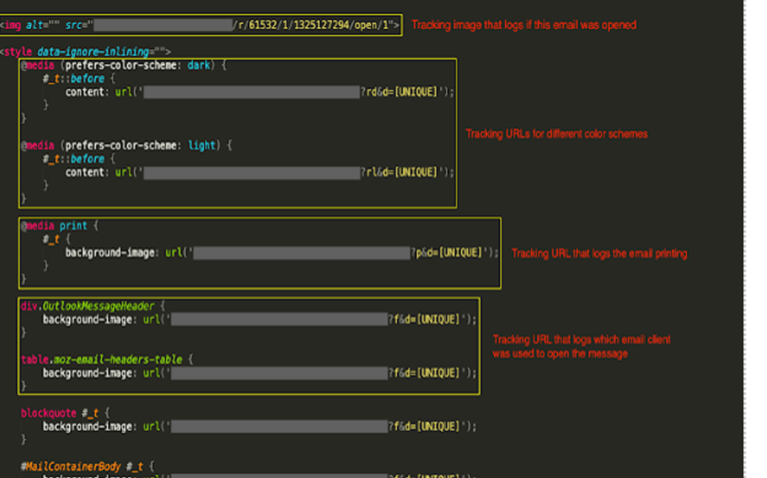 Additionally, CSS enables cybercriminals to track user behavior through spam emails. By embedding properties like the @media at-rule, attackers can conduct fingerprinting attacks, gathering details about recipients’ email clients, system configurations, and actions such as viewing or printing emails.