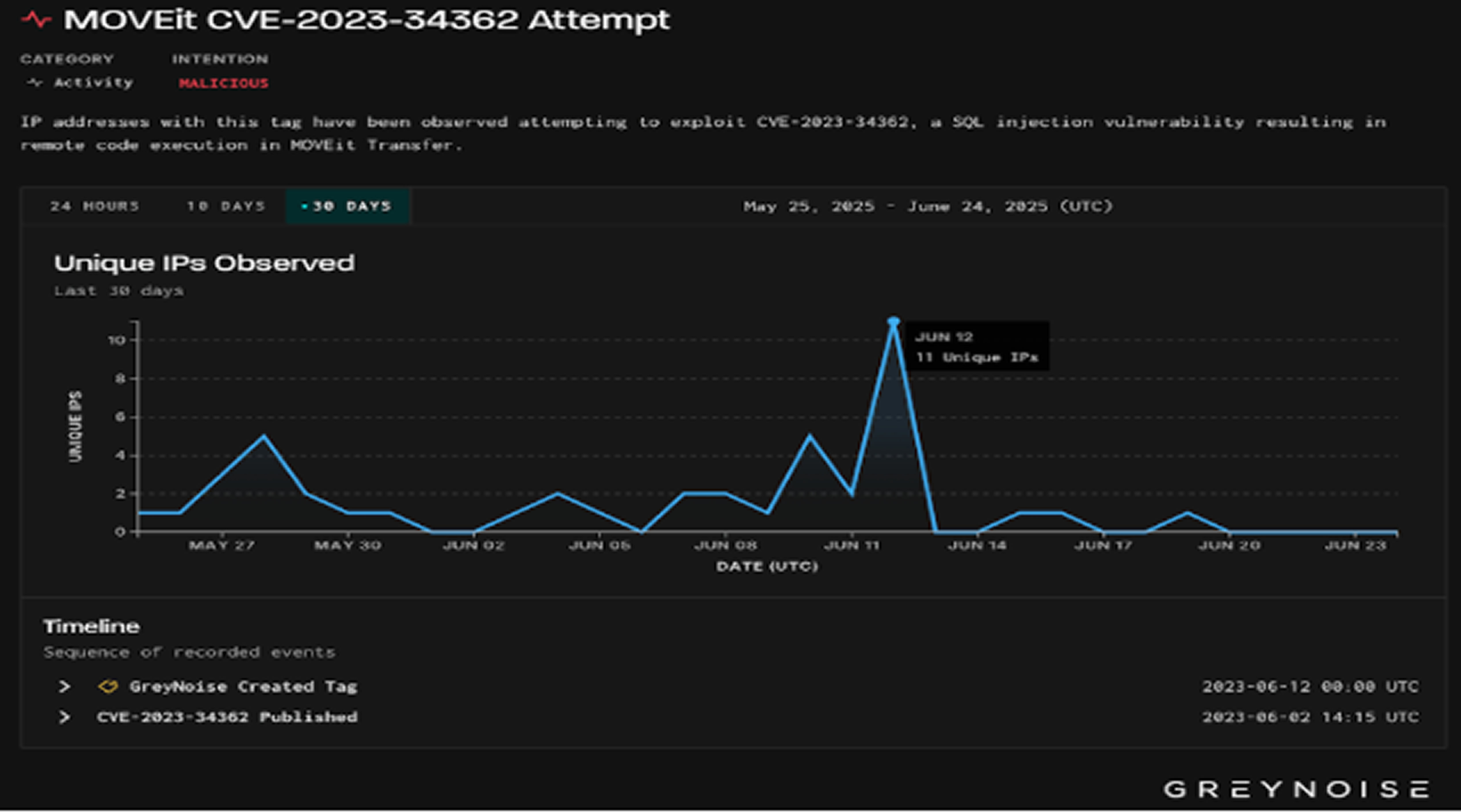 GreyNoise also noted a small number of attempts to exploit two known MOVEit Transfer vulnerabilities CVE-2023-34362 and CVE-2023-36934 on June 12, 2025. The CVE-2023-34362 flaw was previously used by the Cl0p ransomware group in 2023 to launch a widespread attack that affected over 2,770 organizations.