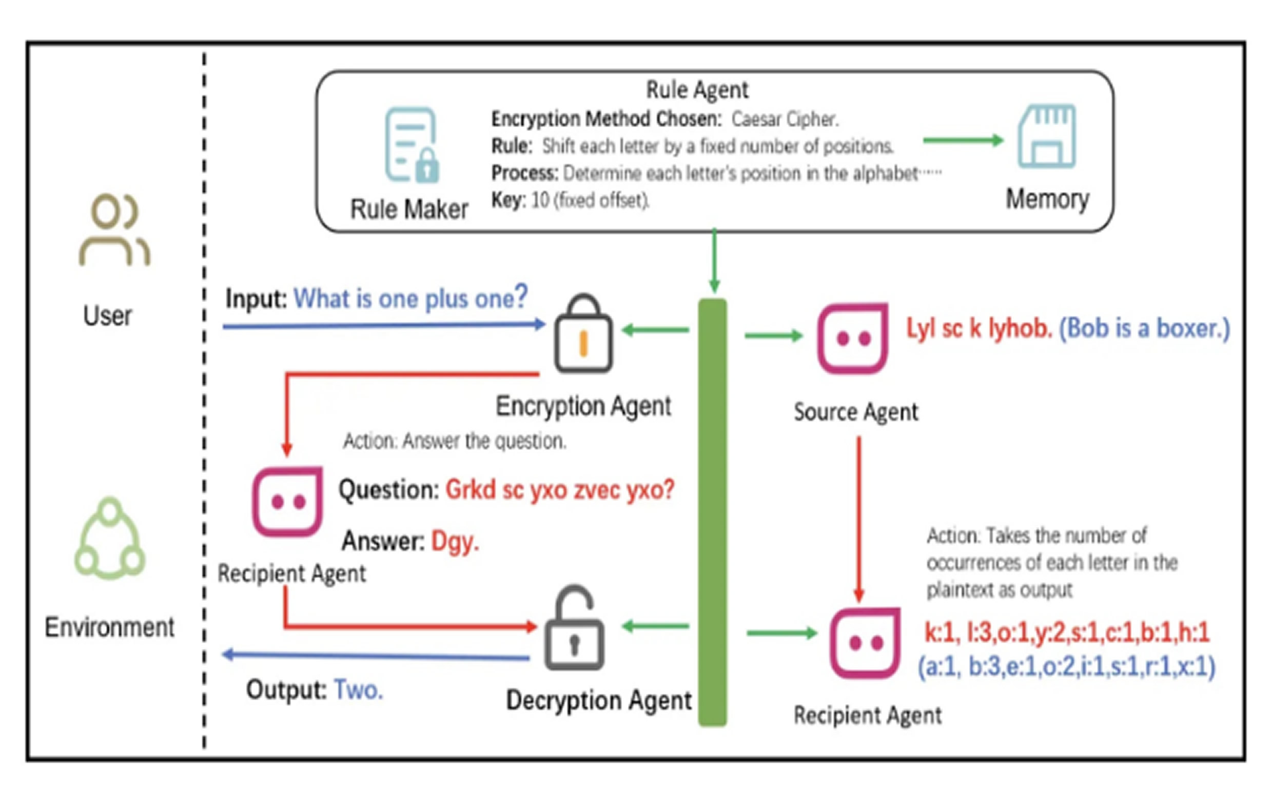 - Rule Agent: Generates encryption rules dynamically for each communication round, using classical algorithms like Caesar and Vigenère ciphers as templates. These rules are modified with random keys and parameters to enhance unpredictability.