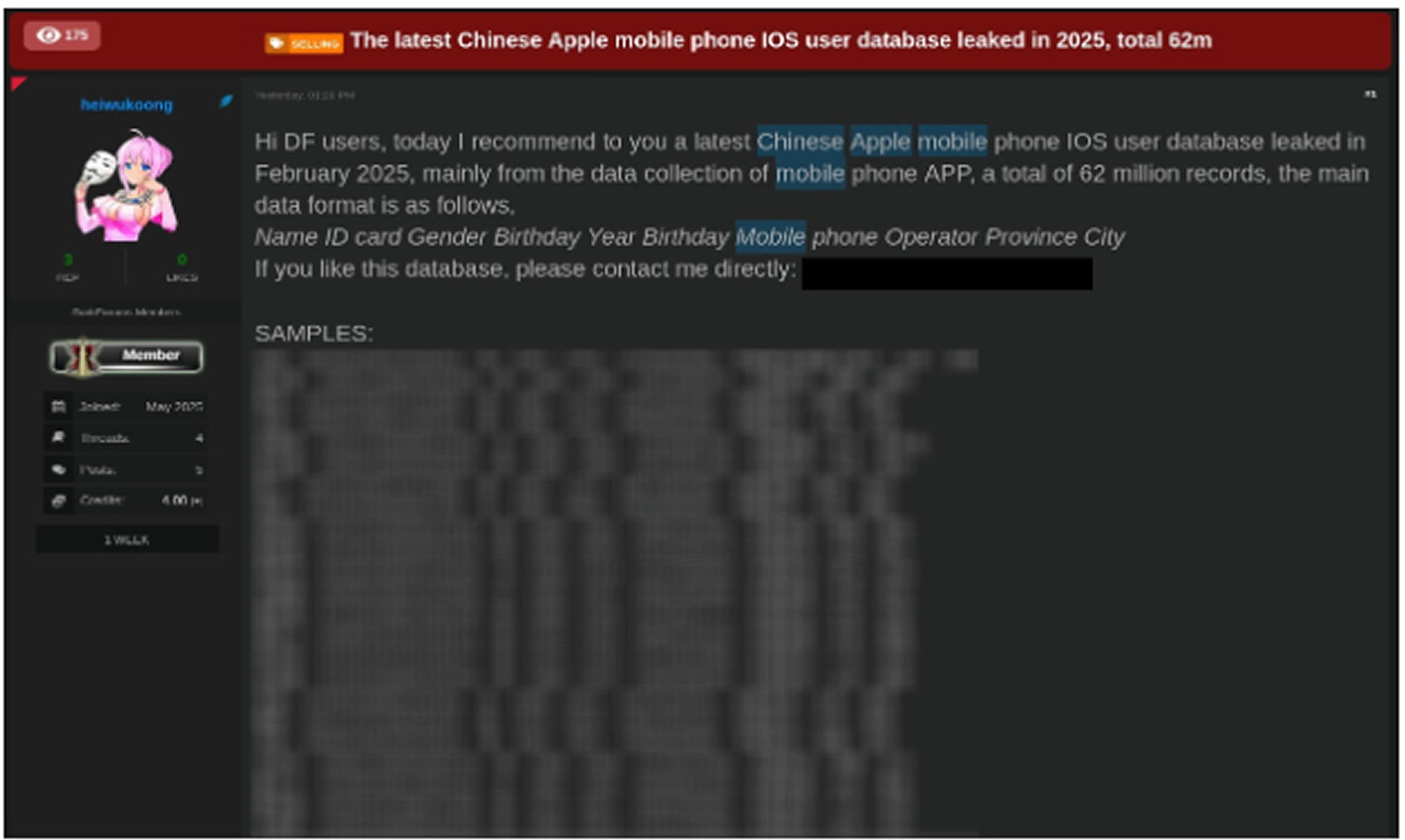 on a popular data leak forum and is said to include information as recent as February 2025. The leaked details reportedly cover sensitive personal identifiers such as names, ID card numbers, genders, dates of birth, phone numbers, and geographic data like provinces and cities.