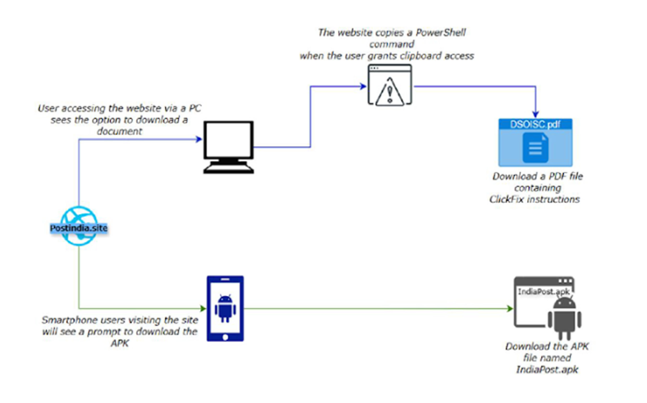 The fake website, postindia site, is designed to deceive visitors based on their device type. Windows users are prompted to download a malicious PDF, while Android users are served a compromised application package named indiapost apk.