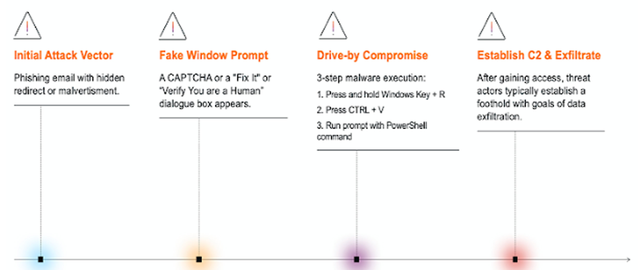 Darktrace highlighted an incident from April 2025 where attackers used ClickFix to download hidden payloads, move laterally within networks, collect system data, and exfiltrate it through HTTP POST requests.