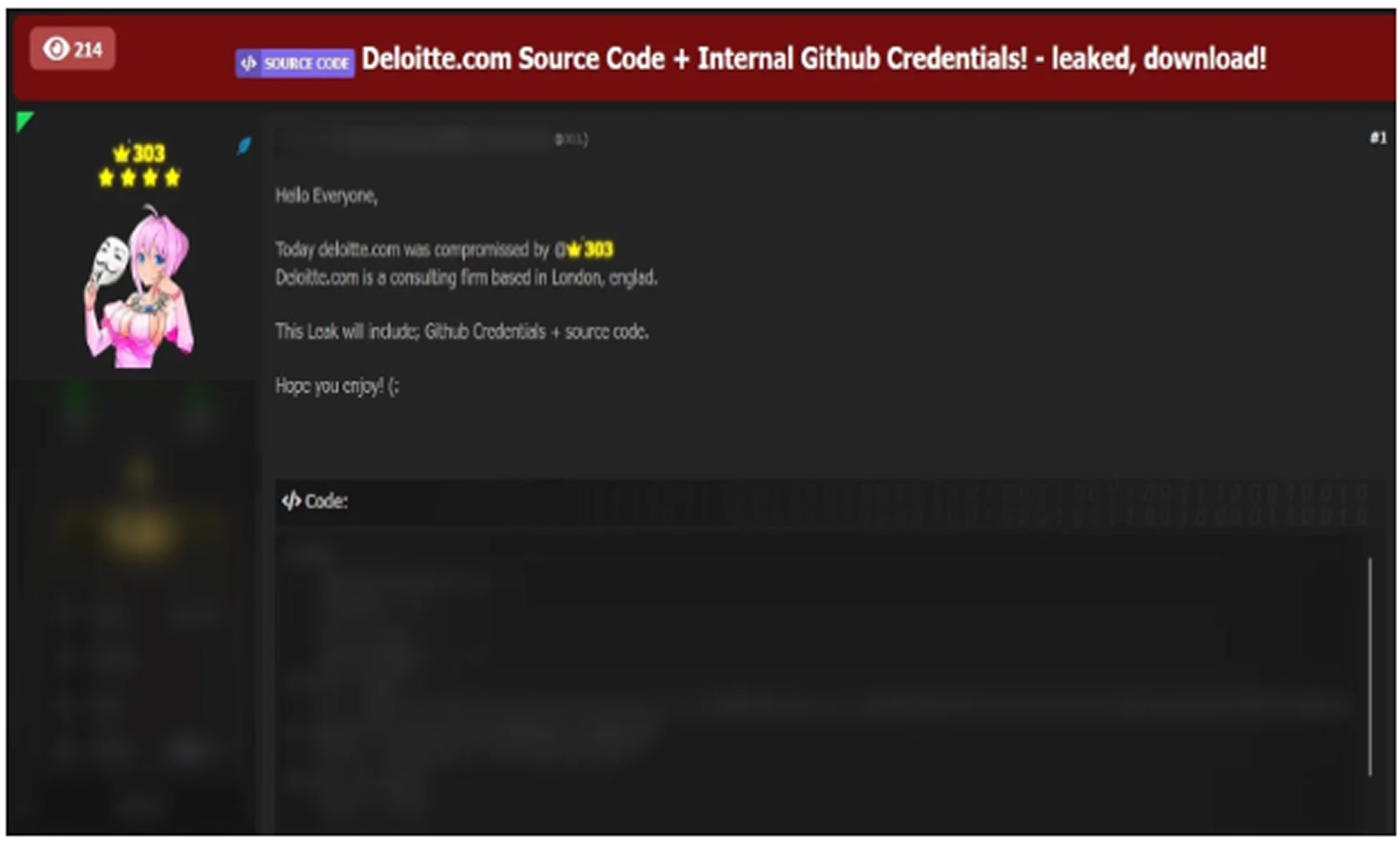 A threat actor known as “303” has reportedly claimed responsibility for breaching Deloitte’s systems and leaking sensitive internal data on a dark web forum. The alleged breach