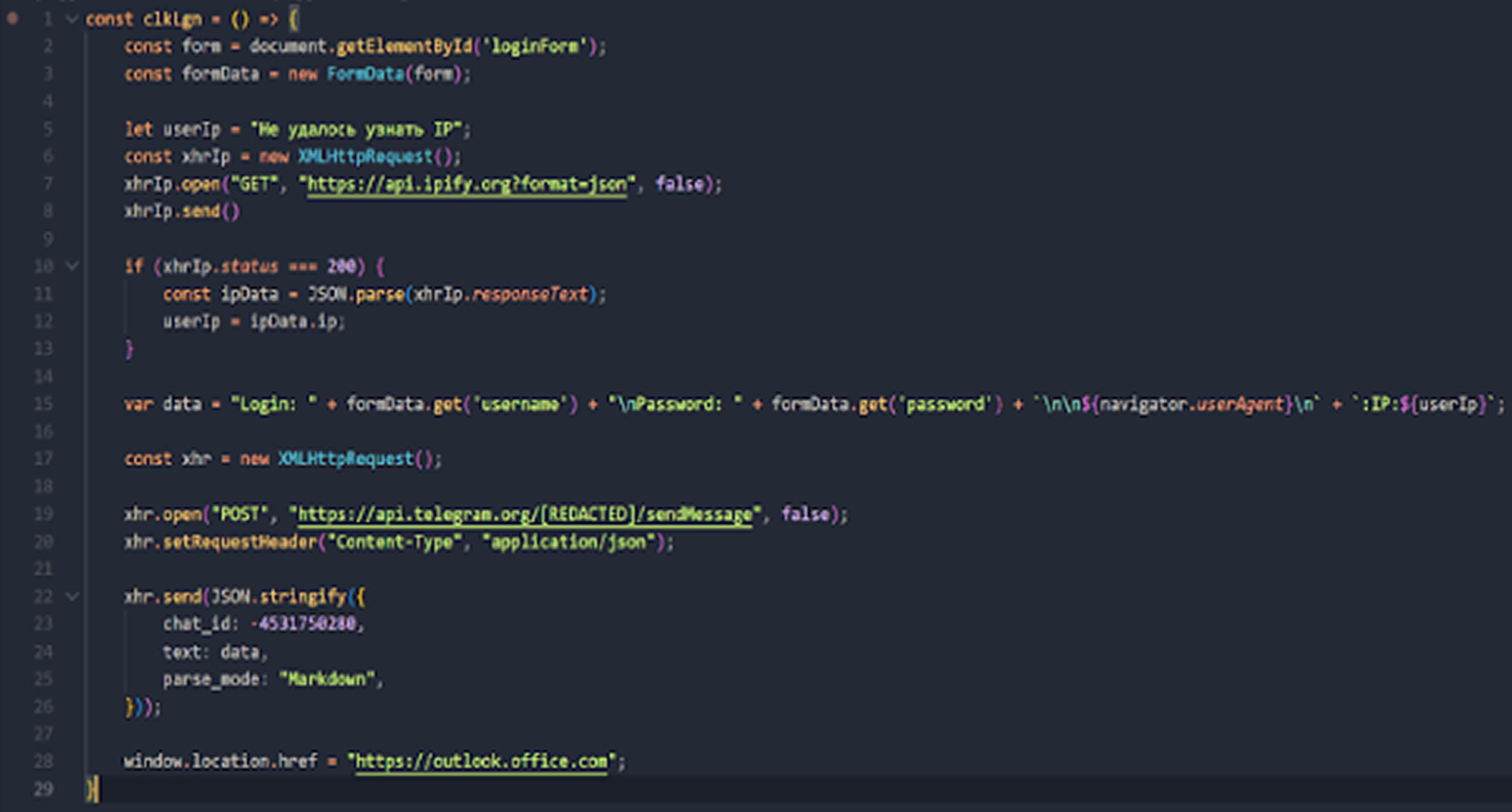 According to researchers Klimentiy Galkin and Maxim Suslov, the malicious JavaScript collects login information from the authentication form and sends it via XHR requests to a page on the compromised server. The page’s code includes a handler function that processes the incoming data and writes it to a file, making it accessible from external networks.