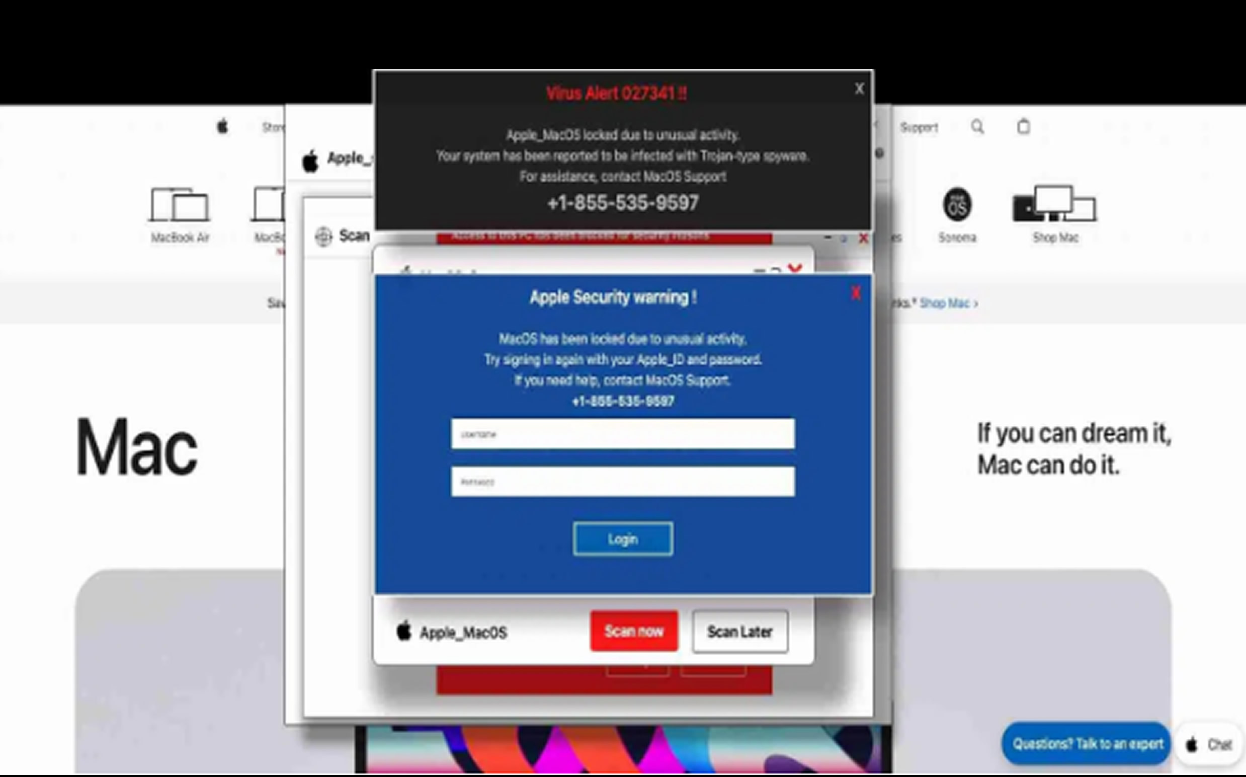 Previously, the attack targeted Windows users by impersonating Microsoft security alerts. Now, the same deceptive techniques are being used against Apple’s ecosystem. The campaign aims to steal user credentials by convincing victims that their computers have been compromised and locked. Simultaneously, malicious code freezes the webpage, creating the illusion that the entire system is unresponsive.
