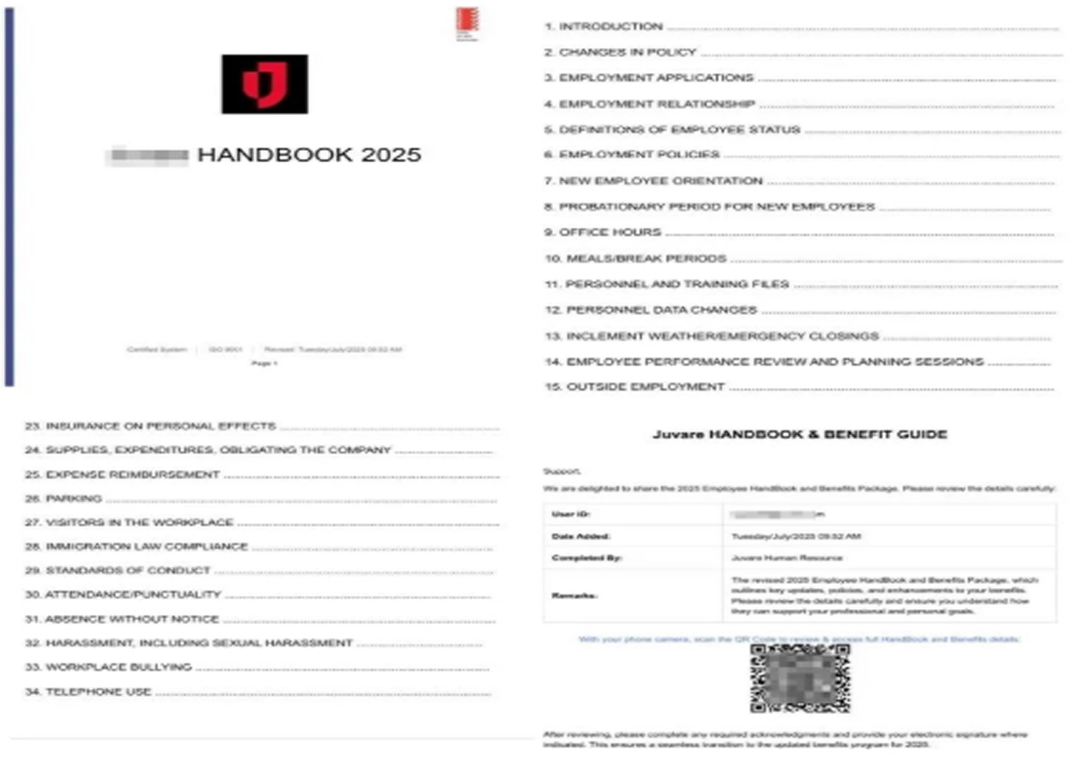 This attack highlights a shift in social engineering tactics, taking advantage of the growing use of mobile devices for quick QR code scanning. The phishing operation unfolds through several stages, beginning with phishing emails that include PDF attachments designed to resemble official corporate documents. These attachments are often disguised as HR manuals or internal announcements, featuring realistic logos and company branding to gain users’ trust.