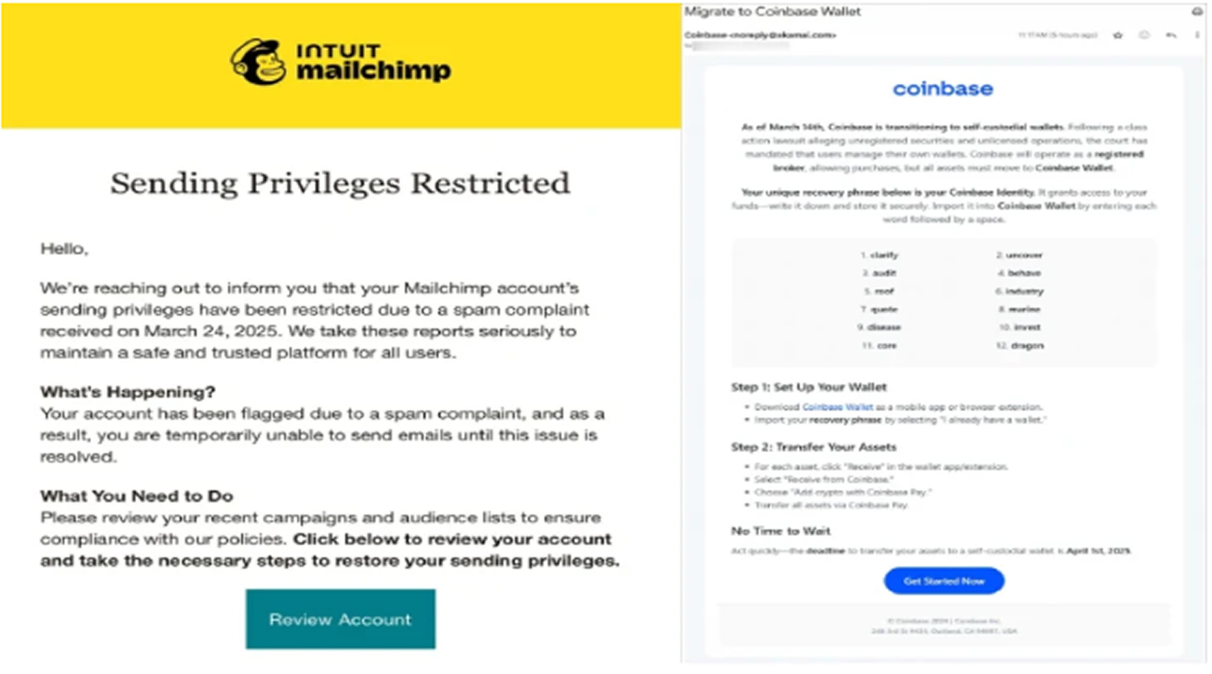 The campaign does not limit itself to crypto-savvy users; both individuals and organizations outside the crypto industry are being targeted. High-profile companies such as Coinbase, Ledger, Mailchimp, SendGrid, Hubspot, Mailgun, and Zoho have been impersonated or targeted through this operation.