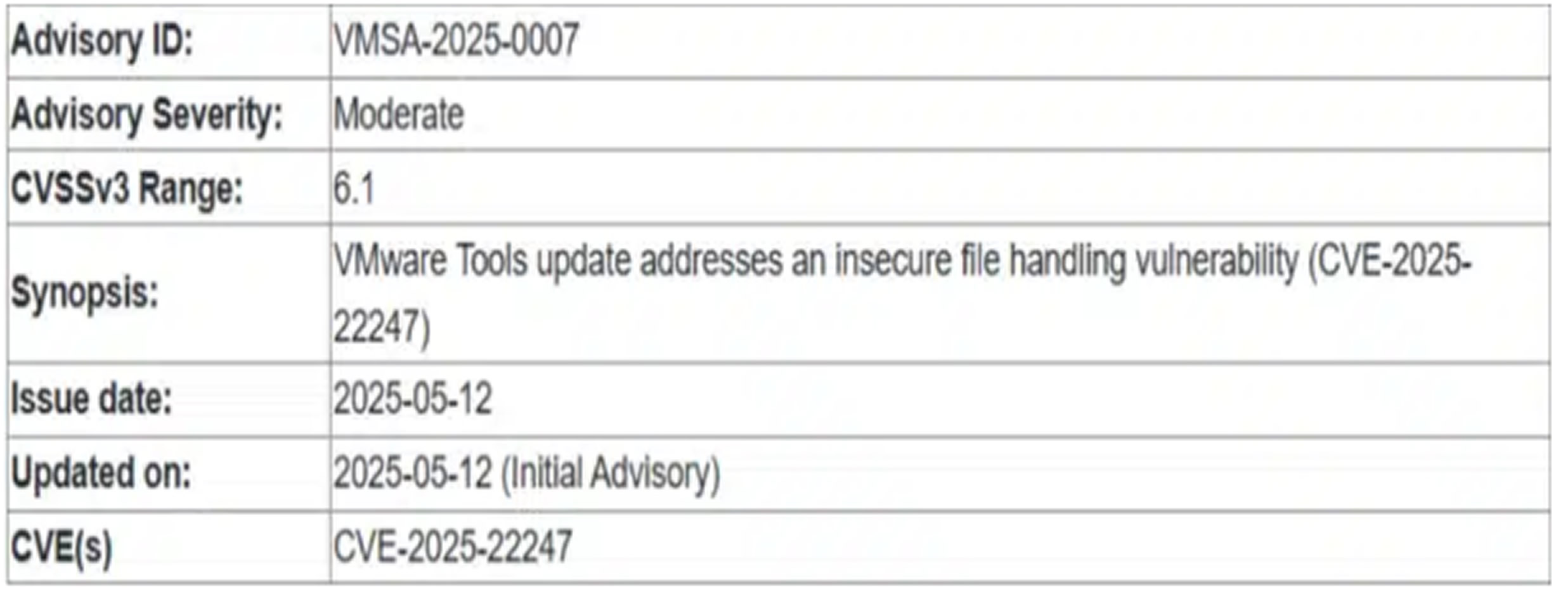 Tracked as CVE-2025-22247, the vulnerability impacts VMware Tools versions 12.x.x and 11.x.x on both Windows and Linux operating systems. The security bulletin (VMSA-2025-0007), published on May 12, 2025, notes that attackers with non-administrative privileges on a guest VM could exploit this weakness to alter local files, potentially causing unauthorized actions within the virtual environment.