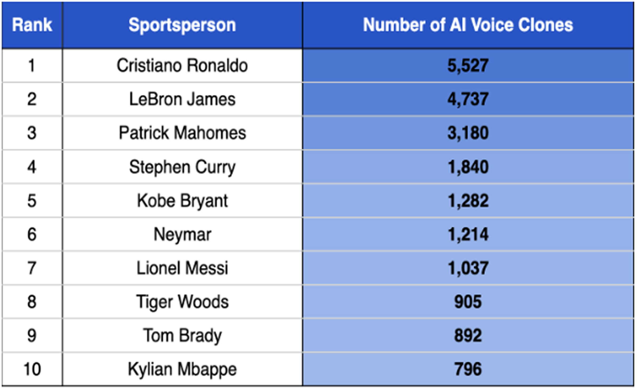 Patrick Mahomes – The Kansas City Chiefs quarterback is the third most-cloned athlete, with over 3,000 instances of AI-generated audio using his voice.