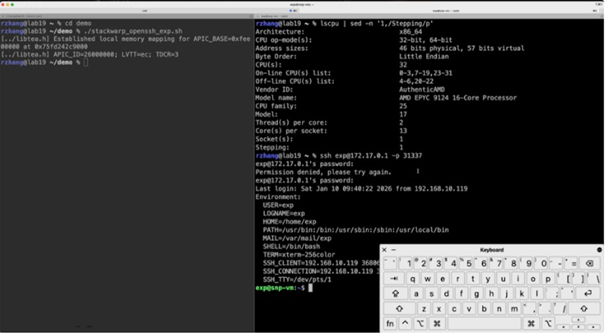 This capability allows attackers to redirect program execution or manipulate critical data. The StackWarp attack can leak sensitive information from SEV‑protected workloads and compromise virtual machines running in AMD-based cloud environments. Notably, researchers demonstrated the ability to extract an RSA‑2048 private key from a single faulty signature, bypass OpenSSH password authentication and sudo prompts, and achieve kernel‑level code execution inside a VM. AMD shipped microcode patches addressing the issue in July and October 2025, with additional AGESA updates for EPYC Embedded 8004 and 9004 processors planned for April 2026.