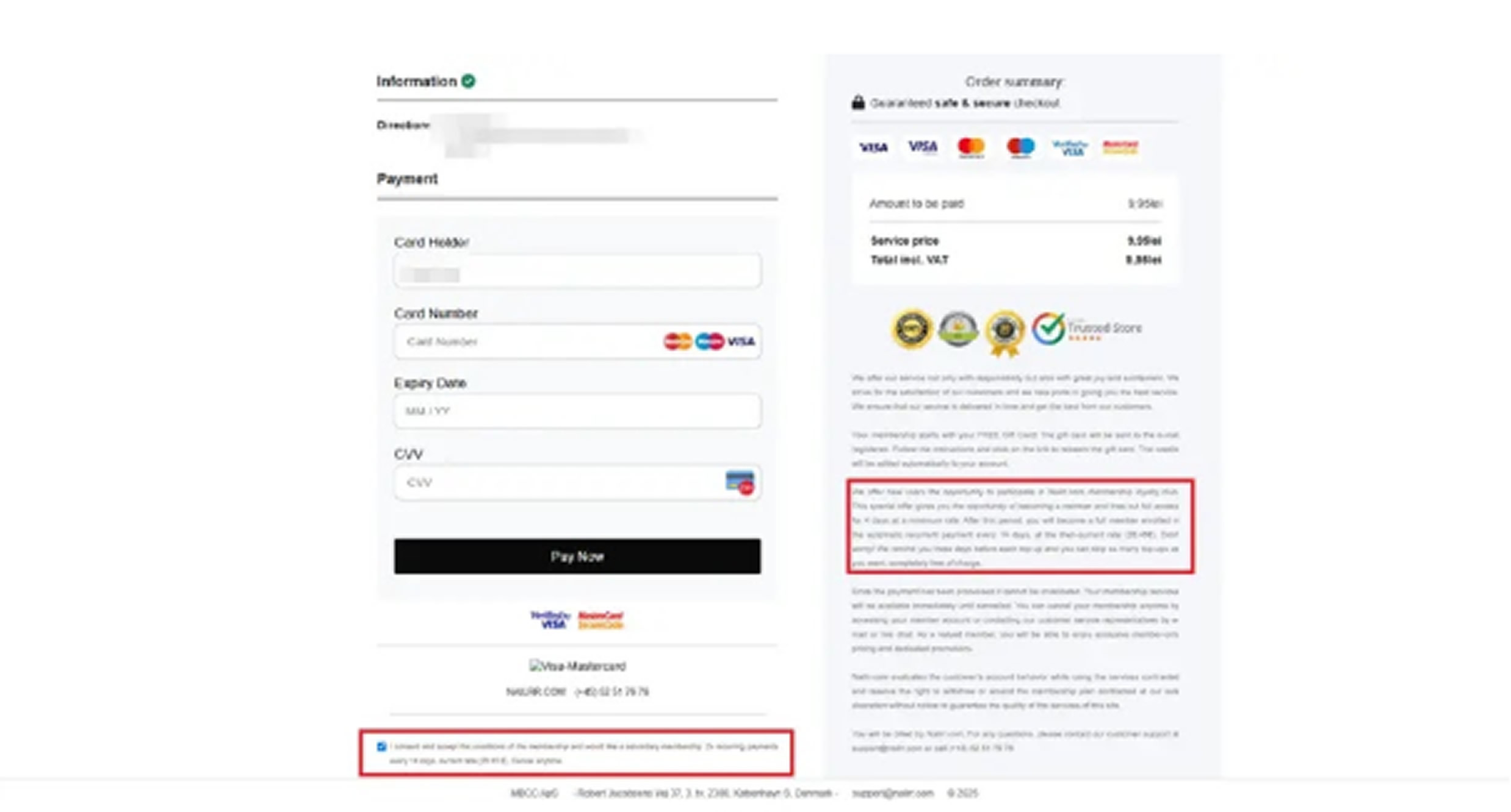What sets this scam apart is its layered deception. Once users reach the payment page, they’re presented with a “membership offer” that appears to promise better deals or perks. In reality, this is a disguised subscription agreement buried in small, easily overlooked text. One example includes an automatic top-up fee of €44 every 14 days, misleadingly described as a benefit.