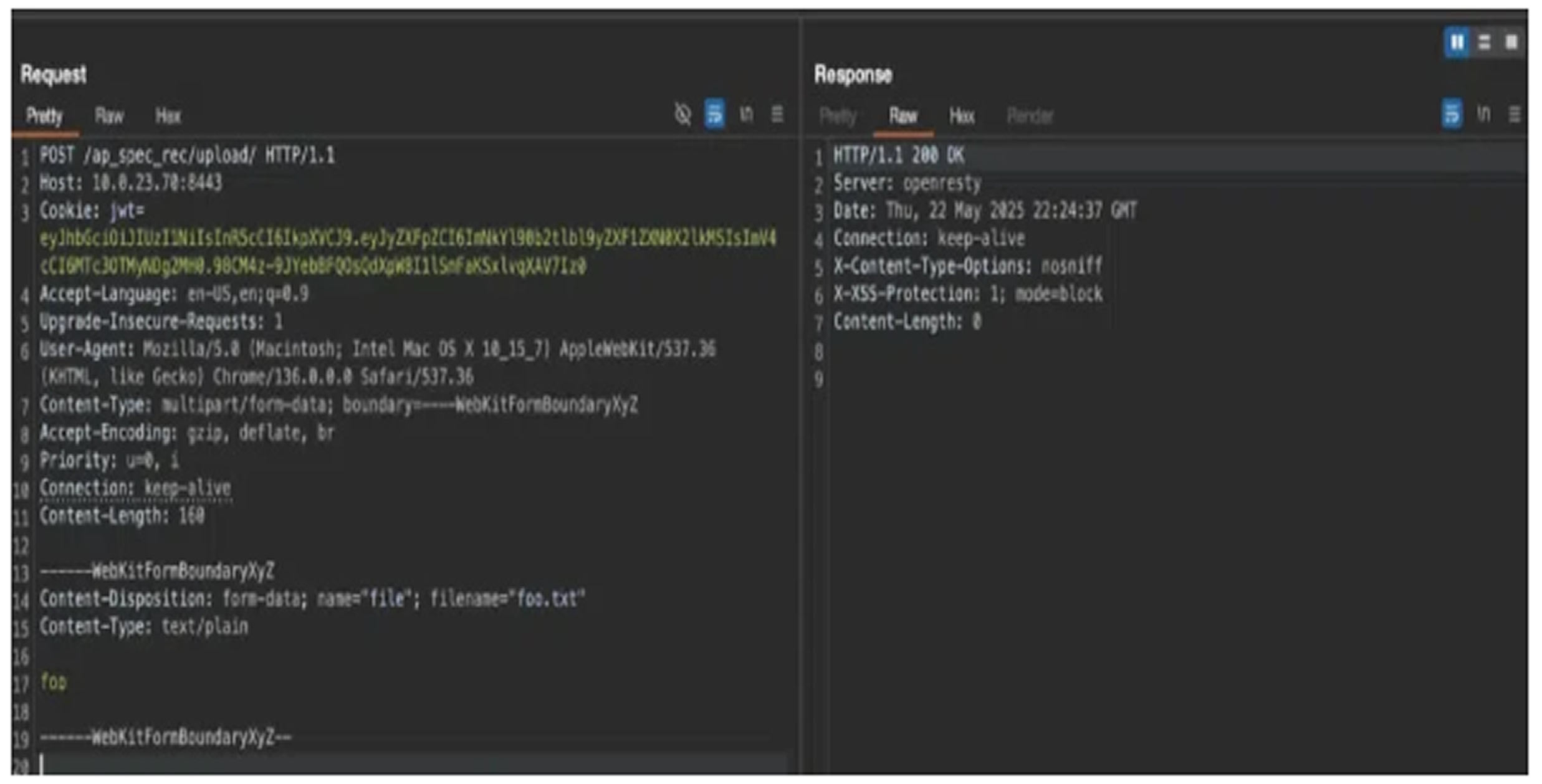 Horizon3’s analysis revealed that the vulnerability stems from a hardcoded fallback JWT secret value ("notfound") used by backend Lua scripts in the file upload mechanism. When the '/tmp/nginx_jwt_key' file is absent, the backend falls back to this default string to verify tokens. This allows attackers to generate valid JWTs using 'HS256' and 'notfound' without needing access to real secrets.