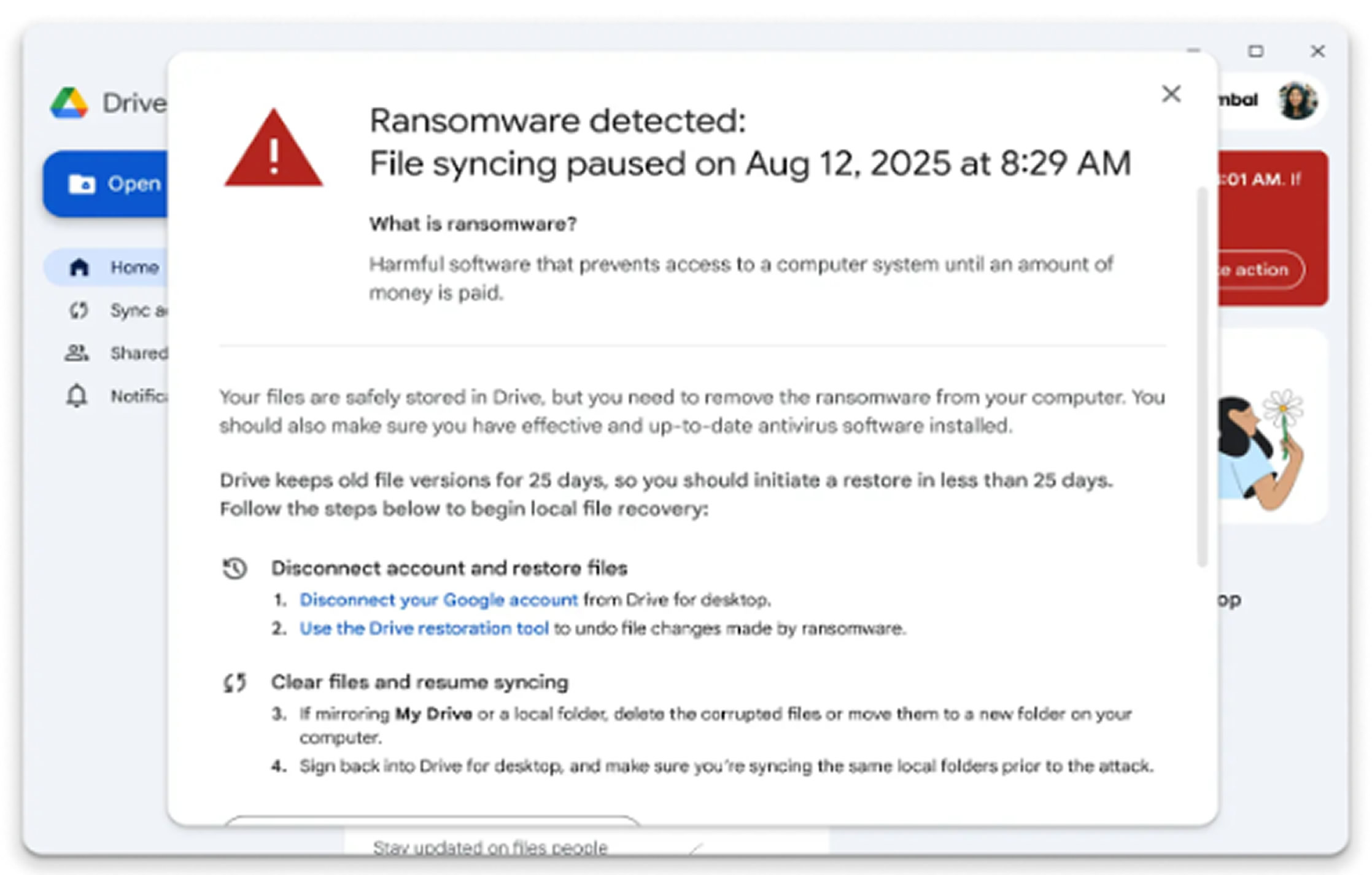 - Pauses Syncing The system immediately stops syncing affected files to the cloud. This action effectively prevents the ransomware from corrupting files stored in Drive and spreading across the network.