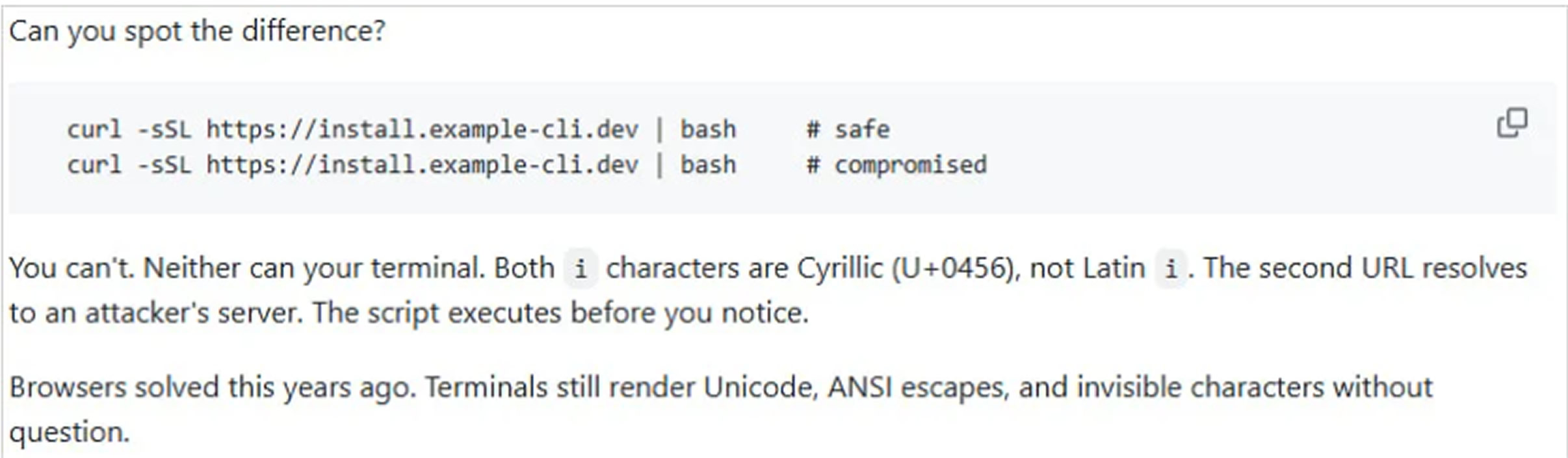 Although modern web browsers have implemented protections against such abuse, command‑line environments remain vulnerable. Terminals can still render Unicode characters, ANSI escape sequences, and invisible characters without warning, according to Tirith’s creator, Sheeki, in the project’s documentation.